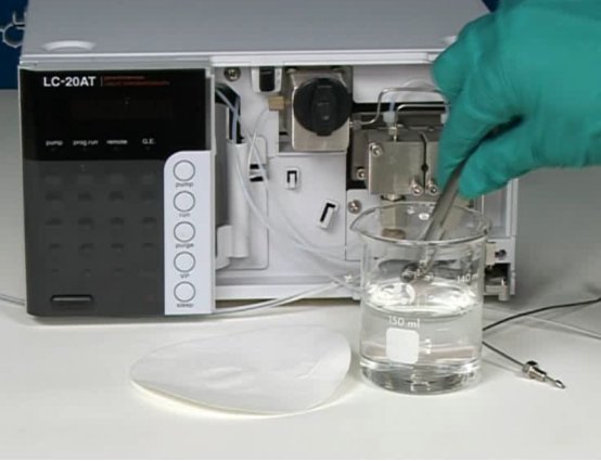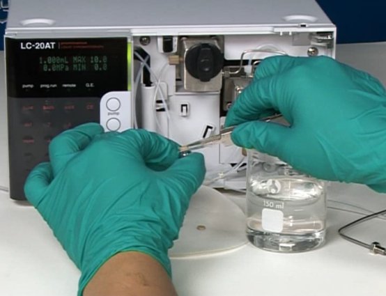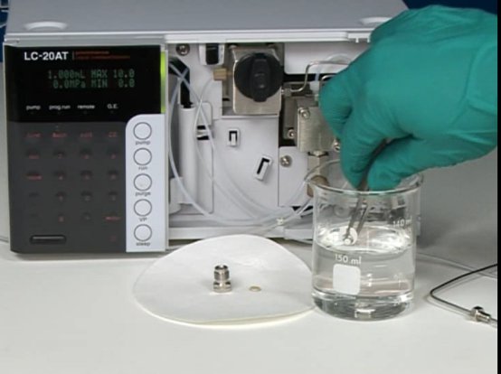 4.打來泵開(kāi)關,用1ml/min的流用水速送入純水,如壓力值超過(guò)0.3Mpa,則更換新的門中過(guò)濾片