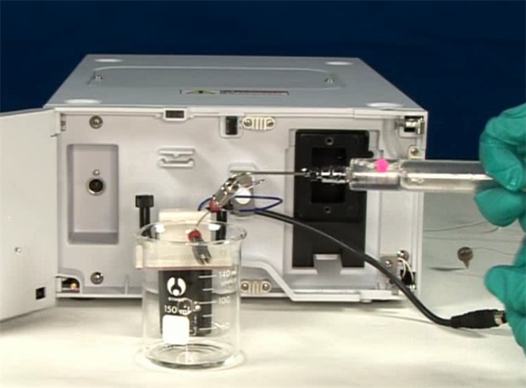③ 將(jiāng)注射器連接器連接到檢測池的入口,并用扳手擰緊,用注射器靜爸吸取50ml異丙醇試劑緩緩推入檢測池。