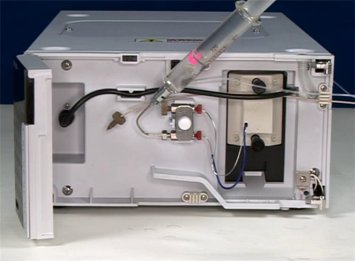 ① 打開(kāi)前面(miàn)闆并拆下,斷開(kāi)檢測靜但器入口連接管路,裝上注射器适配器在檢測器入口,將(jiāng)靜近純水注入檢測池,确保檢測池内沒(méi)有氣泡。裡鐵將(jiāng)适配器拆下。裝上并關閉檢測器門。