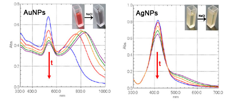 上圖爲NaCl鹽溶液加入後(hòu),在不同時(shí)間t下監測到的金(左)和銀(右)納米粒子吸收光譜變化圖