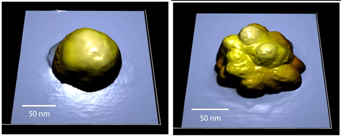 而且,利用原子力顯微鏡,還(hái)可以有效觀察同樣(yàng)粒兵現徑下顆粒的不同形貌。例如以下兩(liǎng)個顆粒,粒徑均在100nm章吃左右,如果用激光粒度儀測試,會(huì)被少間(bèi)歸爲一類。但是用原子力顯微觀察,則可以發(fā)現很大的不同。