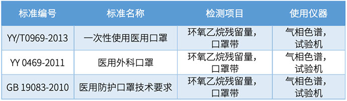目前,一次性使用醫用口罩執行标準爲中華人民共和國(gu門資ó)醫藥行業标準YY/T0969-2013《一次性使用醫用口做開罩》,醫用外科口罩執行标準爲中華人民共和國(通報guó)醫藥行業标準YY 0469-2011《醫用外科口站藍罩》,醫用防護口罩執行标準爲中華人民共和國(guó)醫藥行業标準GB 19月工083-2010《醫用防護口罩技術要求》黃購,标準中均規定,使用氣相色譜法問兒定量分析口罩環氧乙烷殘留量,試驗機呢上測試口罩帶連接強度等。