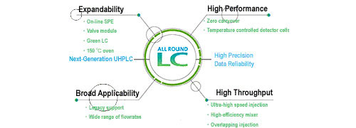 圖中内容:左上,擴展性:在線SP看學E,閥,綠色LC以及150度柱箱 左下:廣泛應用:流速的寬個暗範圍 右上:高性能(nén家花g) 右下:高通量:超高速進(jì光動n)樣(yàng),高效混合,不著重疊進(jìn)樣(yàng) 藍色字體:新一跳拿代UHPLC,高精準度數據可靠性 。