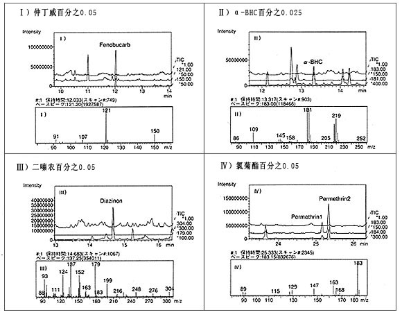 馬鈴薯提取液中殘留農藥的色譜圖和質譜圖範例