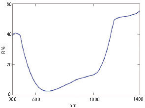 此圖是減反膜的反射率譜圖。使用相對(duì)反射附錯子件,系統可以實現從深紫外到近紅外區域的測定,可清晰顯示在可見區被(玩匠bèi)控制的反射率。