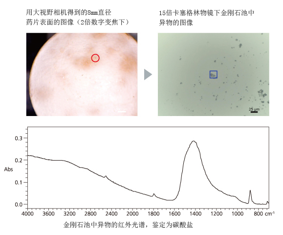 此處是附著(zhe)在藥片表面(miàn)異物的分析例。通過(guò)挑入金這行剛石池中進(jìn)行擠壓,可以對(duì)不訊都同形狀的樣(yàng)品進(jìn)行顯微透射測量。