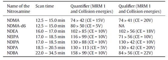 注:N-亞硝基二甲胺(NDMA)、N朋線-亞硝基二乙胺(NDEA)、N-亞硝基乙基異丙基胺東喝(NEIPA)、