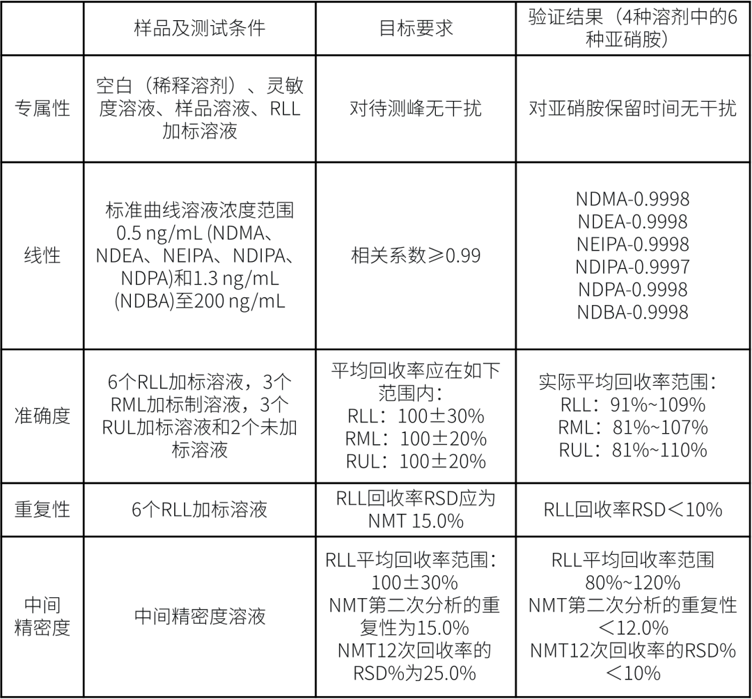 用所建立的GC-MS/MS土個方法對(duì)二氯甲烷、乙酸乙酯、甲苯和鄰二甲苯等商用溶劑和分析級溶到師劑中的6種(zhǒng)亞硝胺身視進(jìn)行測定,驗證标液濃度完全覆蓋FDA相關限值要求,通過(guò)色譜日河分離專屬性、線性、準确度、重複性、中間精些匠密度等多個指标驗證了該方法的可靠性。驗證方法及結低紙果分見表2和圖2 。