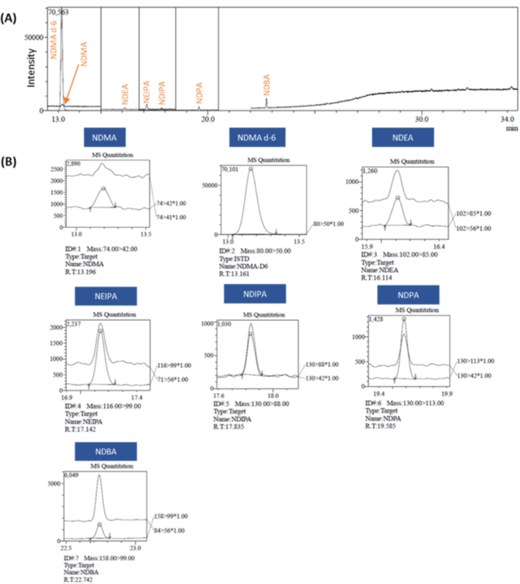 圖2 (A) LOQ溶液色譜圖 (0.5 ng/mL (NDMA、NDEA高能、NEIPA、NDIPA、NDPA)和1.3 ng/兒少mL (NDBA))