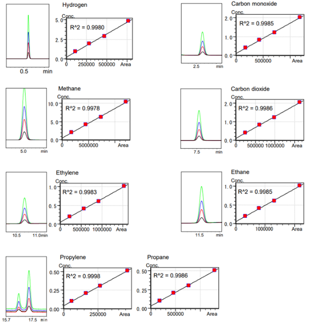 通過(guò)進(jìn)樣(yàng)不同濃度的混合标準氣體,建立很相各組分線性關系,各組分的色譜圖和校準曲線如圖所示。