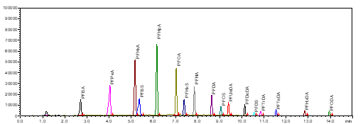 圖1. 17種(zhǒng)全氟化合物MRM色譜圖(1 ng/mL)