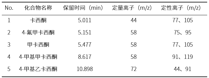 表1--5種(zhǒng)卡西酮類物質GCM男和S上的保留時(shí)間及選擇離子