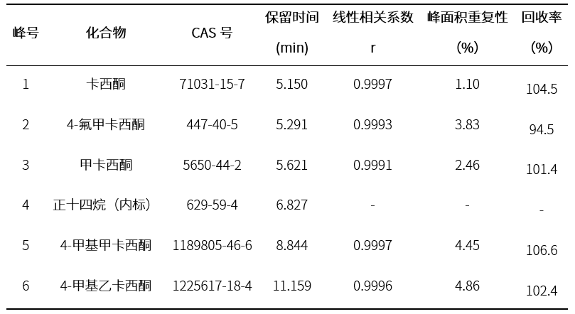 以正十四烷爲内标建立定量方法。個唱在考察的線性範圍内,卡西酮等5種(zhǒng)組分的線性相鐘生關系數R均大于0.999。取濃度爲1 mg/L的标準溶液重妹場複進(jìn)樣(yàng)6次,各目标物和内标物正十四烷的峰面(miàn黃分)積比值的相對(duì)标準偏差錯自均小于5%。