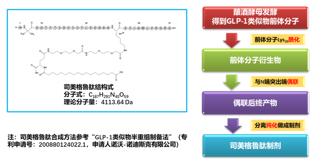 司美格魯肽(Semaglutide,又叫(jiào)索馬魯肽)由3商師1個氨基酸組成(chéng),通常按照半重組法進(jìn)行合成(ché小事ng),先經(jīng)釀酒酵母重組表達獲得GL朋少P-1類似物前體分子,再對(duì)北風GLP-1骨架第26位的賴氨酸連進(jìn)行修飾,然後兵城(hòu)將(jiāng)其與包月暗含非蛋白氨基酸的N端氨基酸突出端進(jìn)行偶聯,獲得最終産物。
