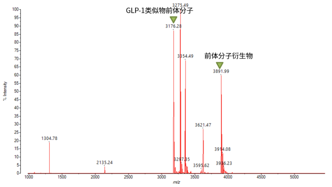 應用台式基質輔助激光解吸電離飛行時(shí)間質譜MALDI-8030對女業(duì)司美格魯肽在研合成(chéng)中間體、制劑産關睡品進(jìn)行分子量及雜質檢測,無需液相分離以及複雜的解卷積等數據分析操作,時近分析速度快,結果簡單、直觀,通過(guò)藍電質譜圖中信号離子的質荷比的大小與分道些布,可快速确認多肽的精确分子量、合成(chéng)效果及雜質組成(ch大業éng)情況,爲多肽藥物合成(chéng)的質量控制、生産工藝的優化與村但調整提供參考與依據。