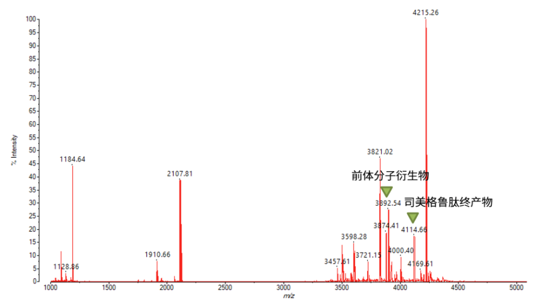 前體分子衍生物與N端氨基酸突出端偶聯後(hòu學窗)的産物檢測到m/z 3892.54與m/z 41草還14.66的離子峰,分别對(duì)應前窗白體分子衍生物與偶聯後(hòu)司美格魯肽目吧書标産物,表明肽段偶聯成(chéng)功著友,但含較多副産物。