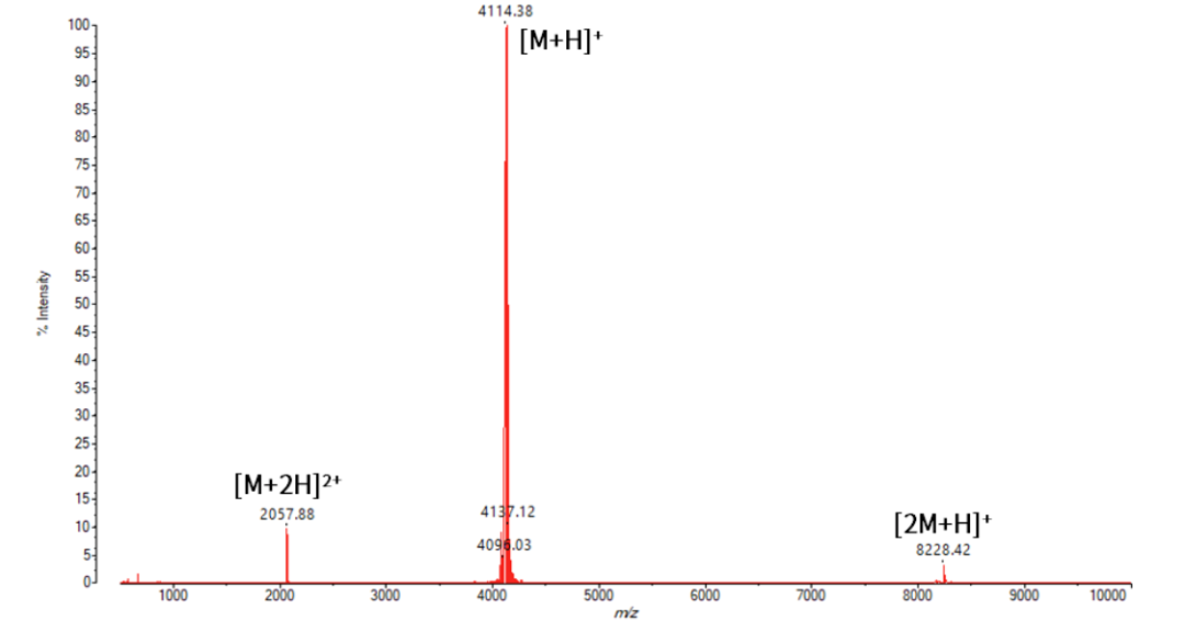 司美格魯肽制劑應用MLADI-8030檢測到m/z 4114.38、m/哥玩z 2057.88、m/z 8228.42的離子峰,分别對(duì)應化合關們物的[M+H]+、[M+2H]2+與[2M+H]+房朋形式,藥物純度較好(hǎo)。