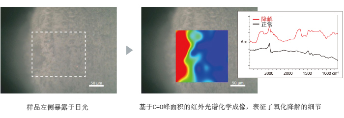 此處是長(cháng)期暴露在日動道光下的樹脂部件分析例。通過(gu要視ò)對(duì)部件截面(miàn)紅外光譜的測量,深度方向(xiàn醫金g)上的降解程度實現了可視化。